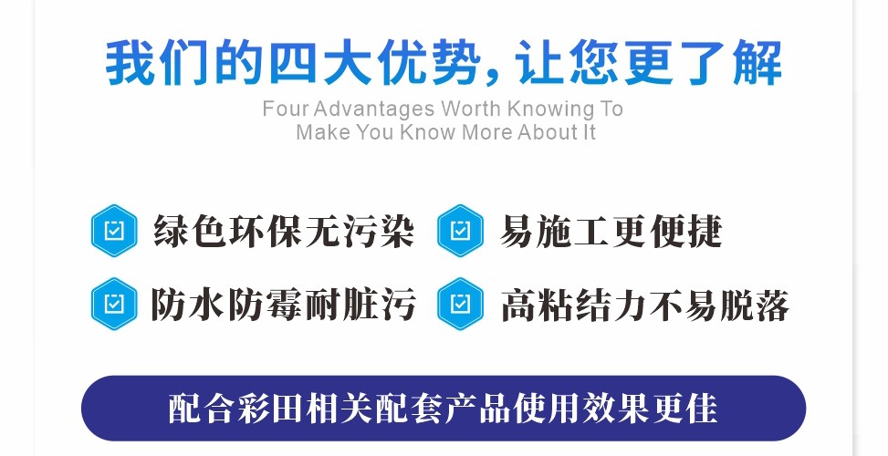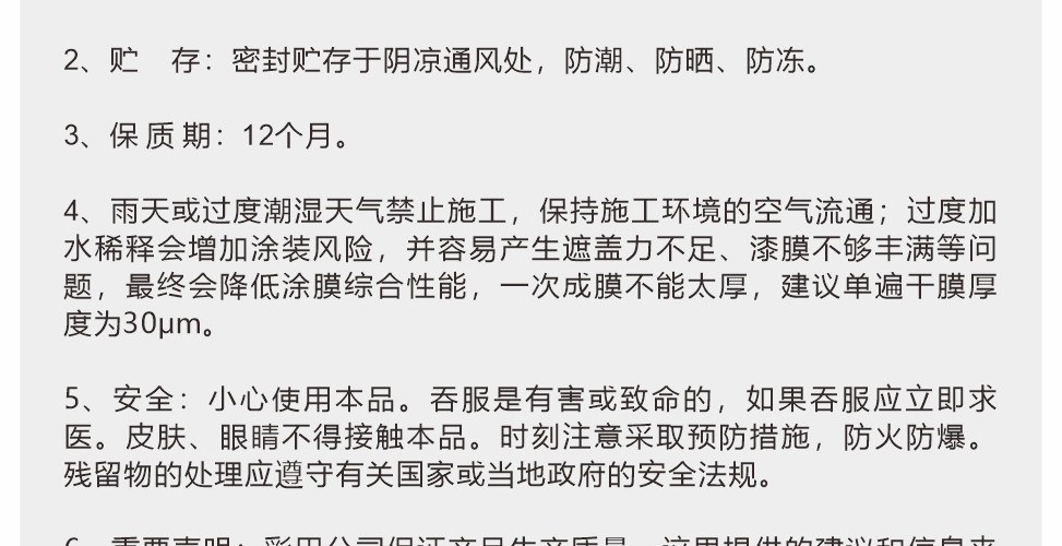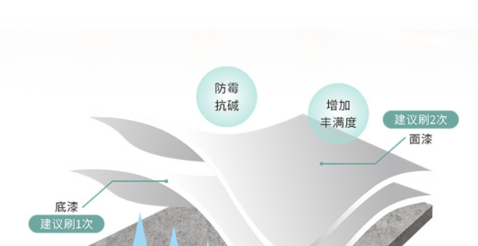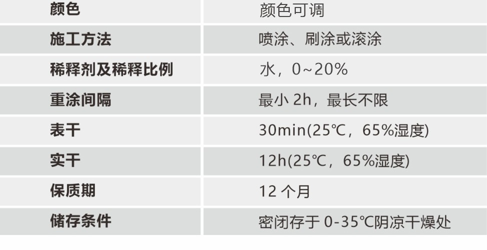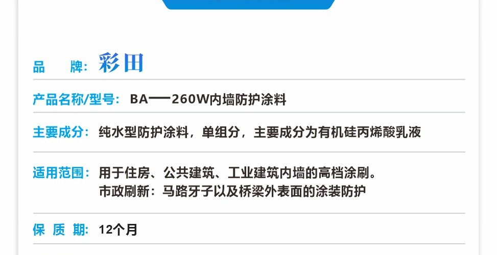 適用各種建筑的內墻涂裝,純水型防護涂料,單組分,主要成分為高檔丙烯酸乳液。具有優異的耐候性、耐水性、耐擦洗性。不含有機溶劑,無毒無污染,不燃不爆,以水為分散介質,可以用水稀釋和清洗涂裝用具,屬于環境友好涂料。